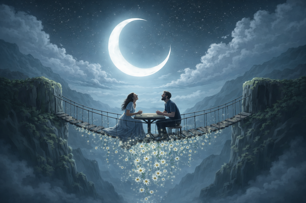 One winter night, while the moon hung in the sky like a thin crescent, a woman and a man meet at the two ends of the valley. They do not know each other. They have no names yet. But neither of them turns back. The woman only says, “Forty nights.” The man does not answer and steps forward quietly. On the first night, the bridge is almost invisible. The wind makes the ropes tremble, the abyss reminds one of its depth. On the fifth night, steps are still cautious. On the tenth night, the abyss does not seem as terrifying as before. This is because they have grown accustomed to the repetition.